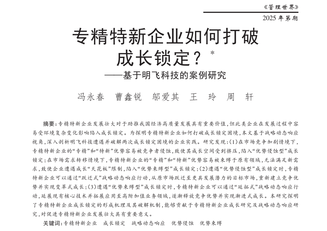 近日,我院企业管理系冯永春副教授团队在国内管理学顶级期刊《管理世界》发表学术论文“专精特新企业如何打破成长锁定?——基于明飞科技的案例研究”。