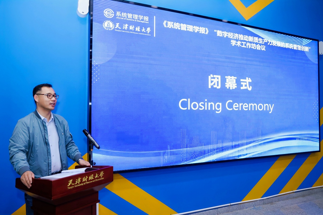 刘玉斌在闭幕式上指出,《系统管理学报》以“数字经济推动新质生产力发展的系统管理创新”为主题与天津财经大学商学院联合举办学术工作坊,旨在为广大学者提供一个展示研究成果、获取专家指导、提高论文质量的平台。天津财经大学商学院历来重视通过搭建学术平台赋能师生。未来,我们将持续依托该平台促进产、研、学一体化发展,为中国新质生产力发展注入源源不断的系统管理智慧,服务“奋进天财、开放天财、创新天财、智慧天财、和谐天财”建设。