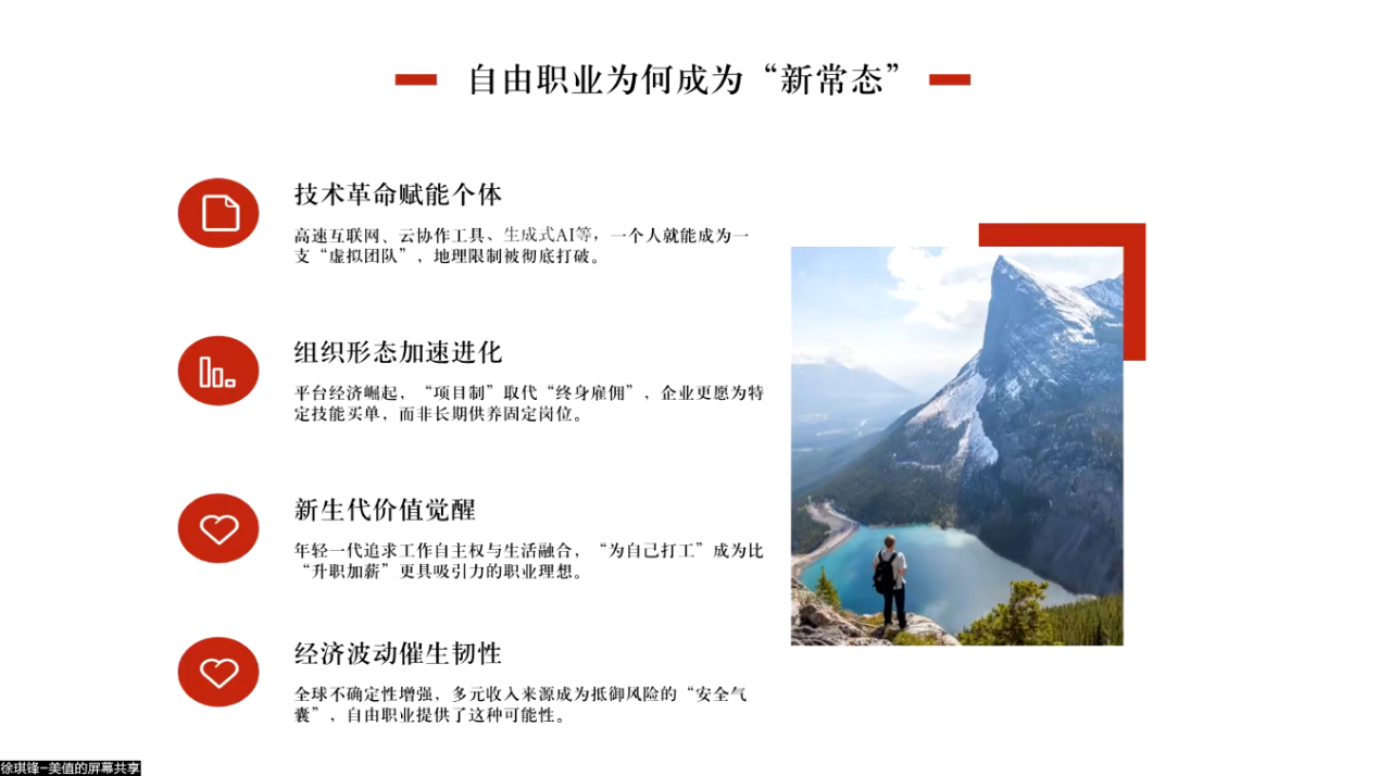 上午,天津财经大学20级广告学本科校友、美值科技创始人徐琪锋,以“自由职业创业:时代趋势下的进阶路径与现实考量”为主题分享。他结合自身从校园兼职积累资源到毕业后创业的经历,提出校园能力积累“六多”原则,拆解“超级个体”成长关键与“一人公司”运营模式,总结“找价值点→做落地产品→签首单→复制商业闭环”的行动路径。