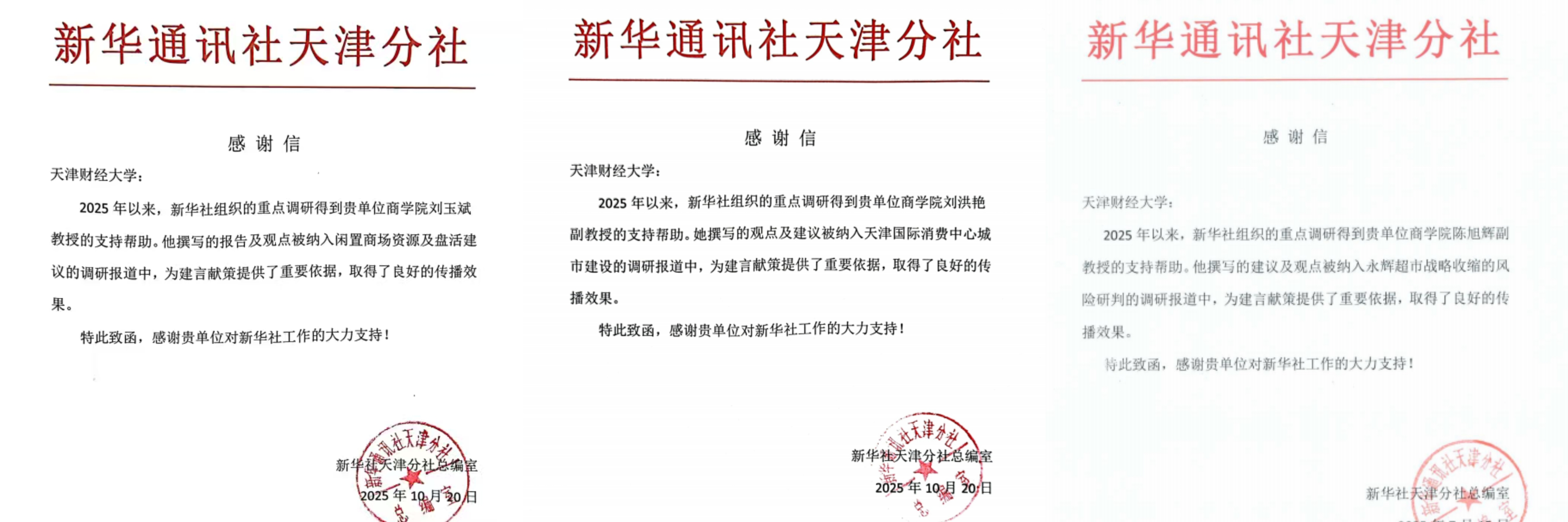 近日,我院收到来自新华通讯社天津分社总编室的感谢信,信中对我院刘玉斌、陈旭辉、刘洪艳三位教师在2025年新华社重点调研工作中给予的支持与贡献表示高度认可和衷心感谢,明确其观点已被纳入他们的调研报道中。