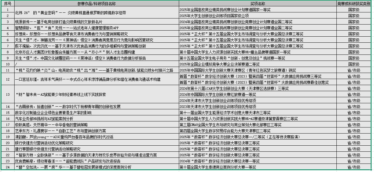 工商管理专业本科生导师制实施两年来,持续取得显著成效,成果丰硕。据统计,在导师们的悉心指导下,企业管理系学子累计斩获各类奖项总数逾140项,其中,国家级奖项10项、省市级奖项60余项。尤其是在全国高校商业精英挑战赛创业计划、大学生创新创业训练项目、全国企业模拟竞争大赛、中国国际大学生创新大赛、全国大学生市场调查与分析大赛等国内顶级赛事中,我系学子大放异彩,涌现出如《北纬26°的“黄金密码”——炎陵黄桃直通俄罗斯的跨境数字纽带》《智慧银龄,“医”“食”无忧——一站式老年人健康管理服务APP》等一批荣获国家级大奖的标杆项目。这些涵盖数字经济、乡村振兴、文化传承等多元领域的斐然成绩,是“导师引路、学生探索”协同育人模式的生动实践,充分证明了导师制在激发学生创新潜能、提升综合素养方面的巨大价值(部分获奖项目见下表)。
