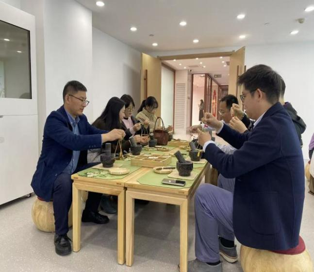 活动伊始,津药达仁堂集团人力资源总监兼健康科技总经理助理汤海洋、津药达仁堂健康科技公司党委副书记、纪委主席、工会主席王存与我院师生代表团在展厅会晤并共同体验中药文化精华,为双方此次深度交流拉开序幕。随后,汤海洋总监介绍了企业发展历程、业务布局及战略规划,从集团在中医药领域的深厚积淀到健康科技板块的创新探索,让大家全面了解了企业的产业优势与发展愿景,为后续合作议题的探讨奠定了认知基础。