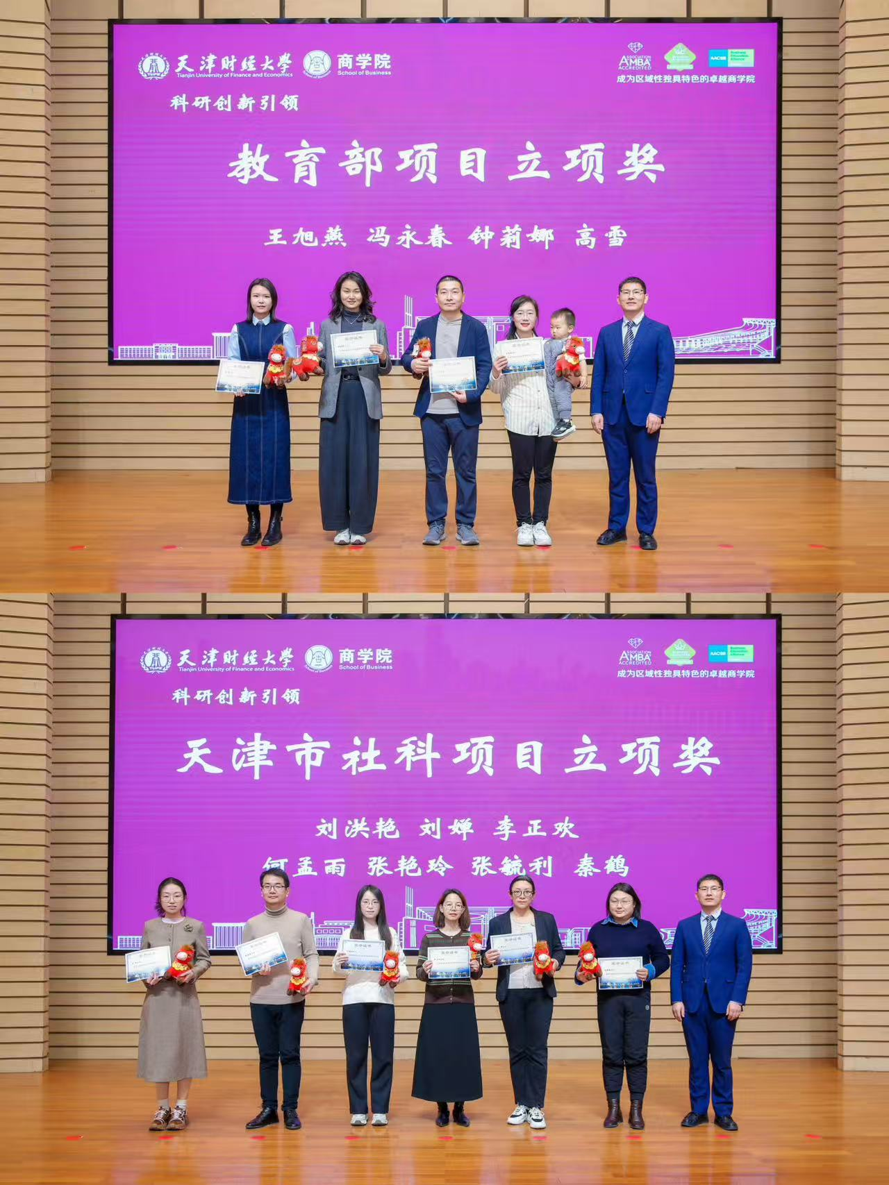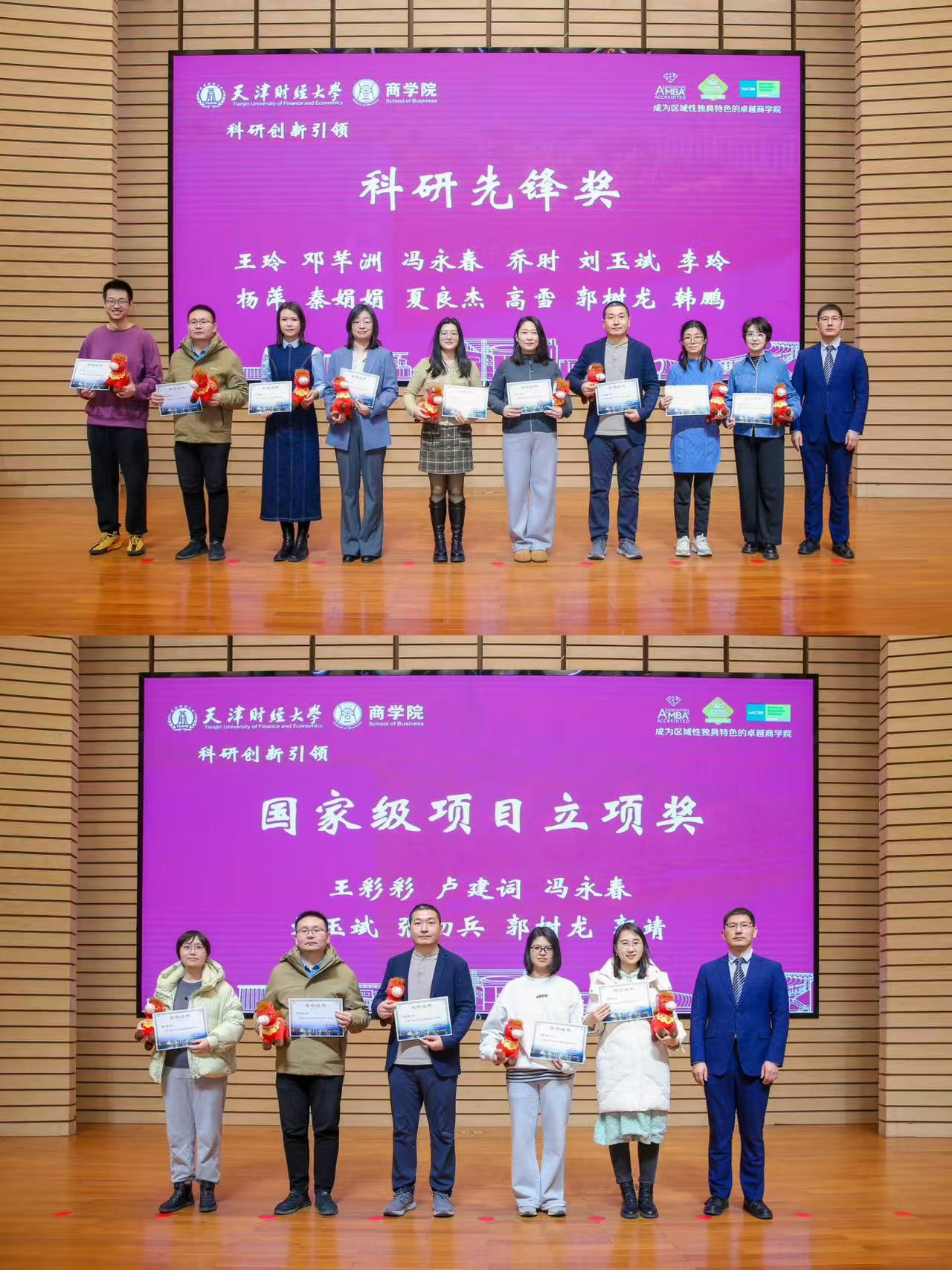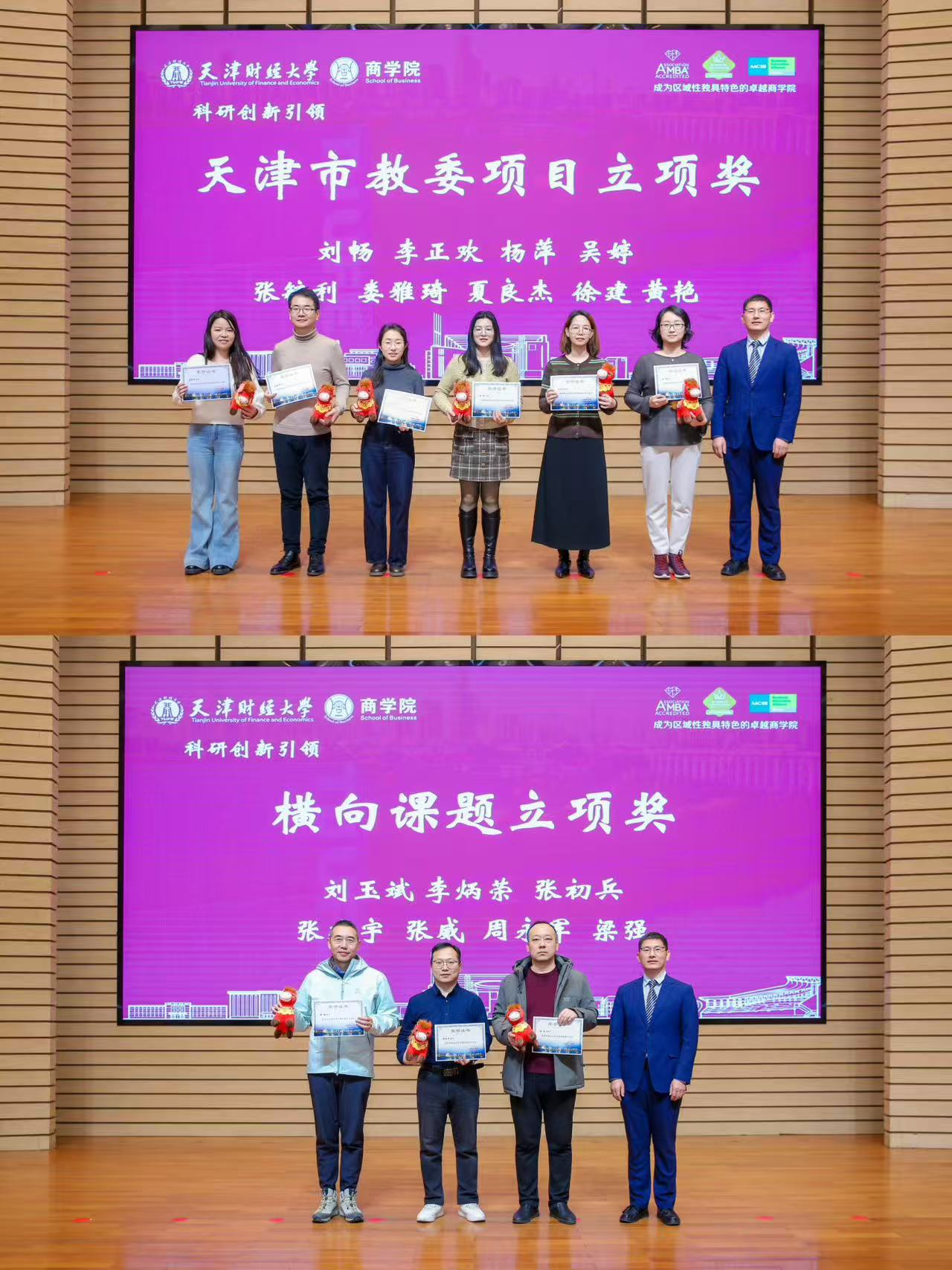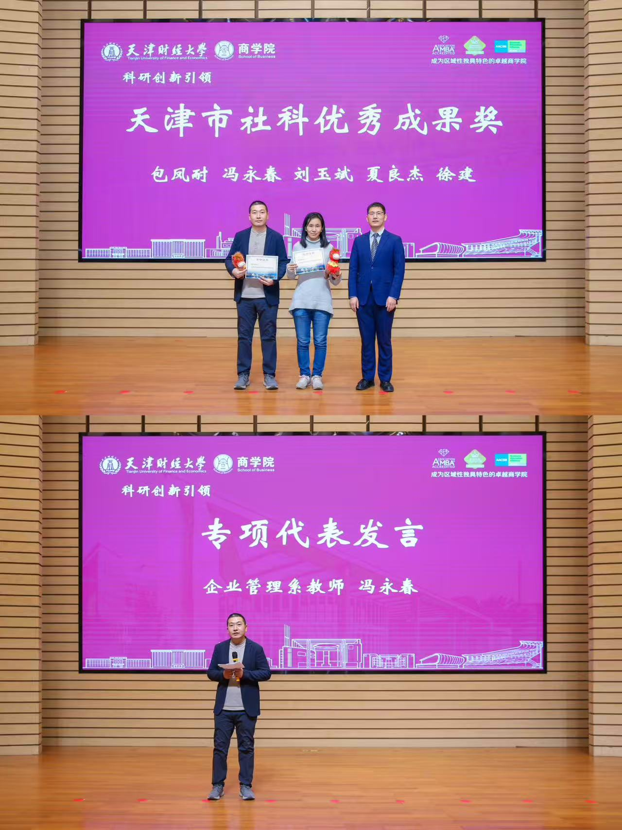 坚持创新驱动发展战略,以有组织的科研推动学科交叉与前沿突破。彭正银老师连续八年主持发布年度研究报告,荣获科研品牌建设奖,成为学院学术影响力建设的标杆人物。王玲、邓芊洲、乔时、冯永春、刘玉斌、李玲、杨萍、秦娟娟、夏良杰、高雪10位教师因发表A类论文获科研先锋奖;郭靖、刘玉斌、郭树龙、卢建词、王彩彩、张初兵、冯永春7位老师获国家级项目立项奖;冯永春、钟丽娜、王旭燕、高雪4位老师获教育部项目立项奖;李正欢、秦鹤、刘婵、何孟雨、刘洪艳、张艳玲、张毓利7位老师获天津市社科项目立项奖;刘畅、李正欢、杨萍、吴婷、张毓利、娄雅琪、夏良杰、徐建、黄艳9位老师获天津市教委项目立项奖;刘玉斌、李炳荣、张建宇、梁强、周永军、张威、张初兵7位老师获横向课题立项奖;包凤耐、刘玉斌、夏良杰、徐建、冯永春5位老师获天津市社科优秀成果奖。冯永春老师作为代表发言,表达对科研使命的坚守与对学院支持的感谢。系列成果充分彰显创新商学院的建设成效。