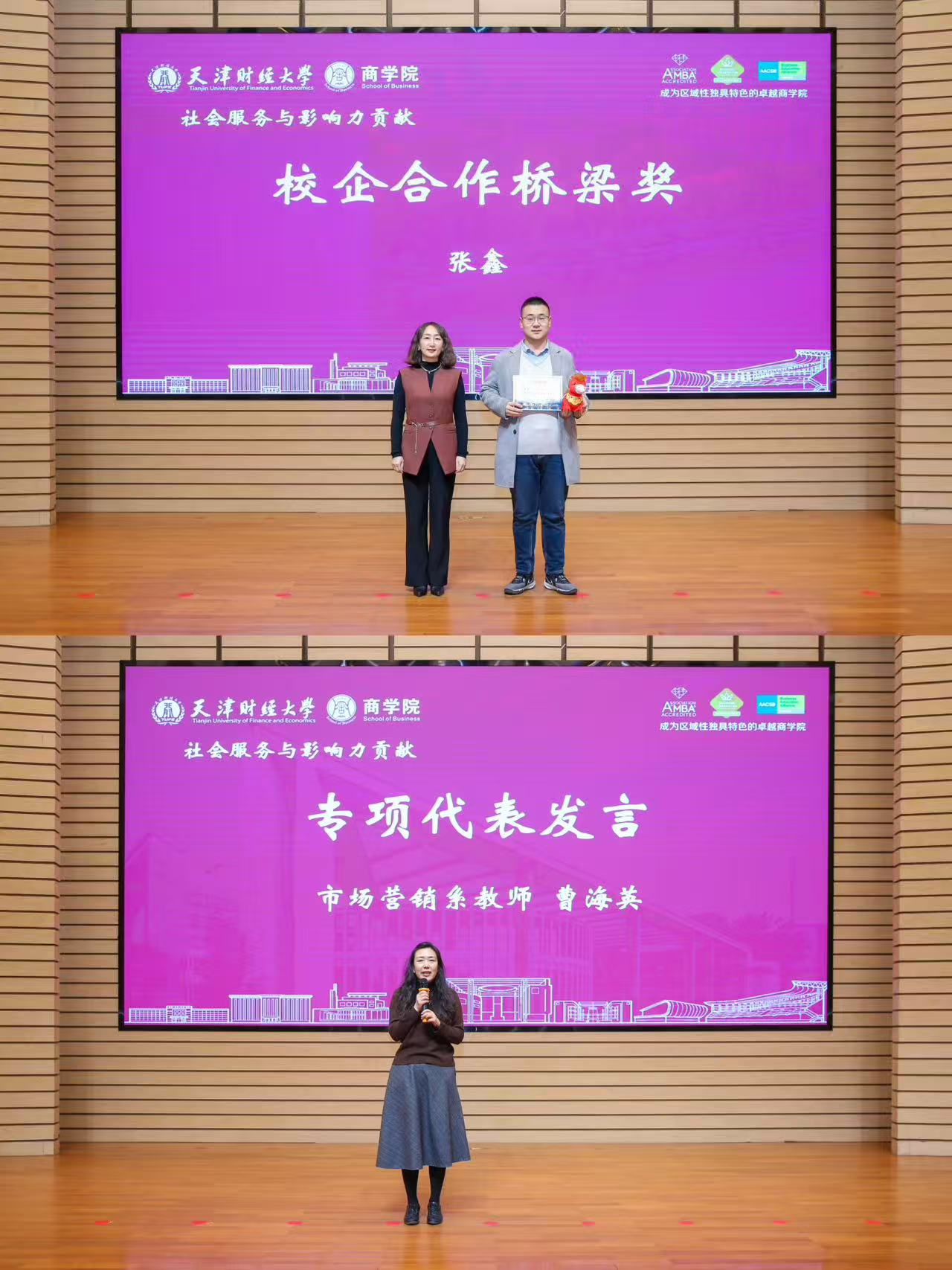 践行大学社会责任,以专业服务社会、以奉献回馈时代。在社会服务板块,王晓凤、李妍、朱莹3位老师积极展现学院良好形象,荣获品牌传播贡献奖;吴婷、姜广省、曹海英、楚天舒4位老师在上合峰会服务中彰显责任与奉献精神,荣获公益服务贡献奖;阿迪拉老师以大爱书写教育担当,荣获边疆教育奉献奖;张鑫老师在校企合作中发挥关键纽带作用,荣获校企合作桥梁奖。曹海英老师代表发言,分享志愿服务与社会服务一线的心路历程,生动诠释和谐商学院的人文温度与社会担当。