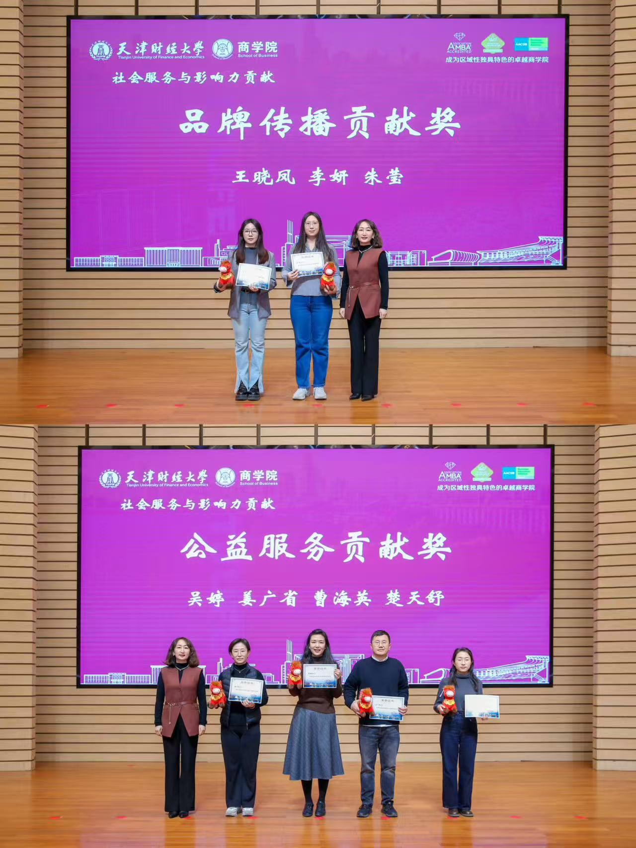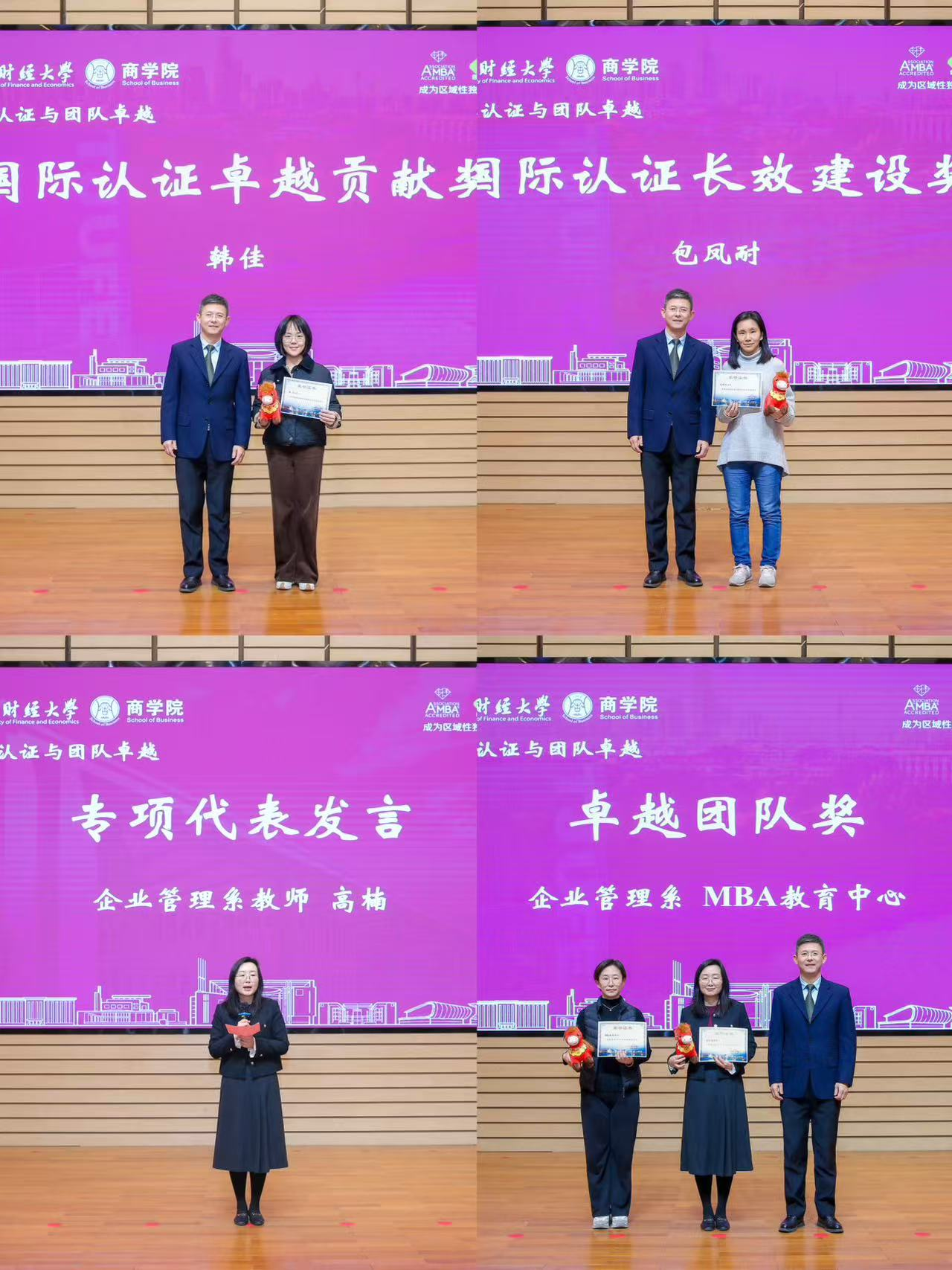 以国际认证为抓手,全面提升办学国际化水平。在国际认证与团队建设板块,韩佳老师获国际认证卓越贡献奖,包凤耐老师获国际认证长效建设奖(商学院成为天津市唯一获得AMBA和BGA认证的学校)。AACSB认证团队郑方老师、朱雅彦老师紧盯任务进度,顺利完成学院首个UA报告,以扎实工作为国际商学院建设奠定坚实基础。企业管理系与MBA教育中心凭借年度核心工作中的突出表现,双双荣获卓越团队奖。高楠老师代表团队发言,展现商学院教师团结协作、追求卓越的精神风貌。