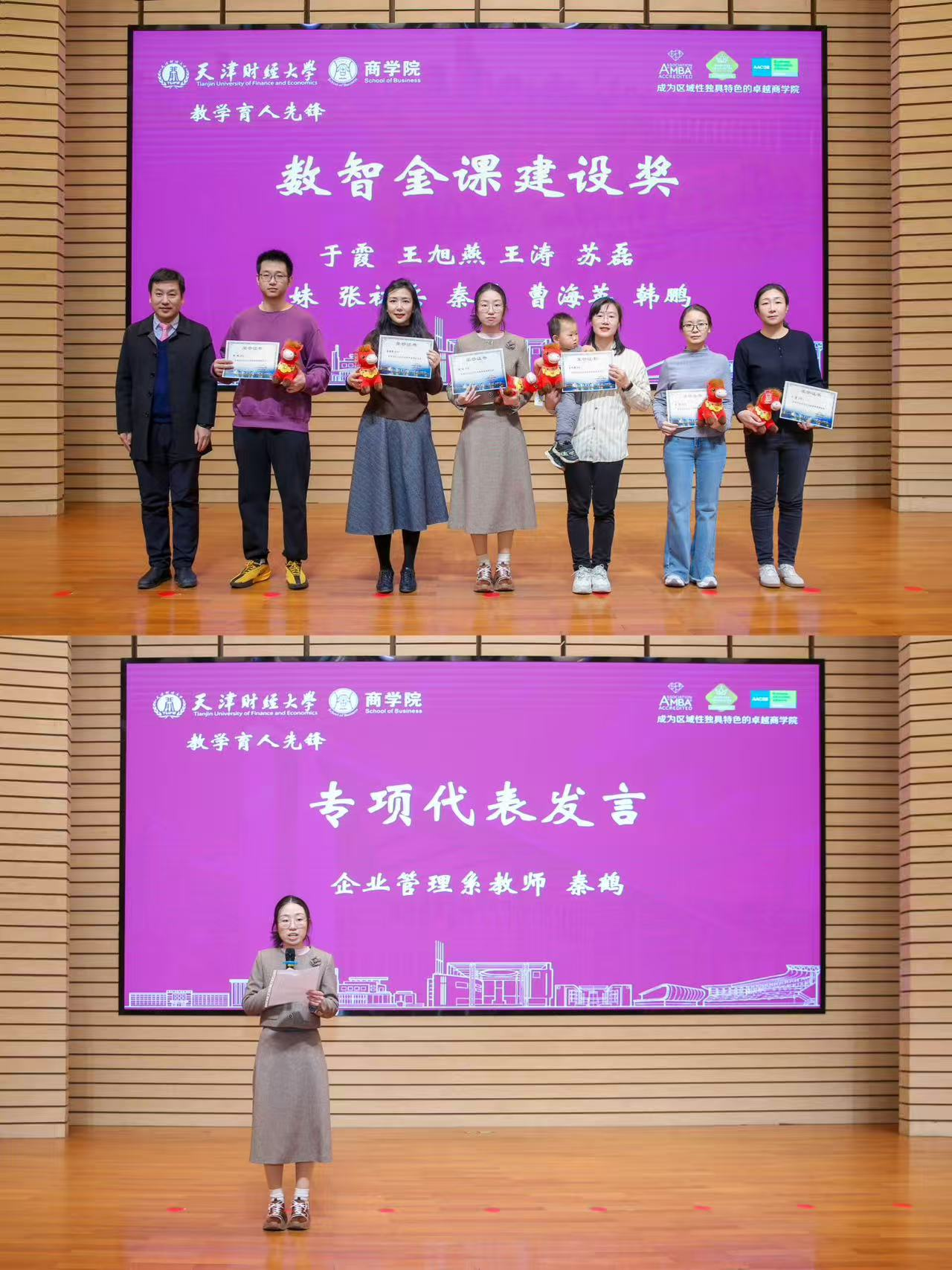 坚守立德树人初心,将思想政治教育贯穿人才培养全过程。在教学育人板块,王玲、王熹、张初兵三位老师荣获杰出研究生导师奖;高楠老师荣获产教育人改革奖;于霞、王旭燕、张初兵、王涛、苏磊、李妹、秦鹤、曹海英、韩鹏9位老师获数智金课建设奖,以数字化手段赋能课程思政创新;张建宇、苏磊、李妹3位老师获师德头雁新风奖,以高尚师德引领育人风尚;辅导员周童童老师获基层堡垒筑梦人奖,扎根学生工作一线,践行思政商学院的使命担当。秦鹤老师作为代表发言,分享育人初心与实践感悟。