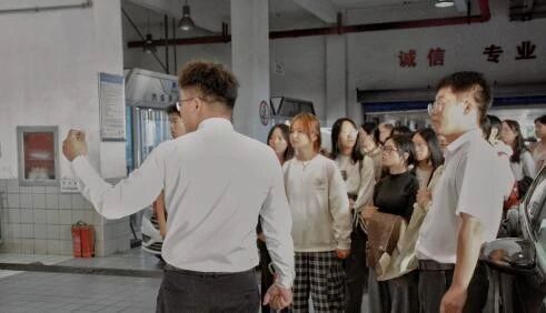座谈结束后,师生们开启沉浸式参观体验,全方位感知汽车行业运营生态。在赵天龙的带领下,大家走进汽车展厅,深入了解汽车销售业务的全环节,直观感受市场端对产品与服务的需求导向;随后,陈涧生带领同学们走进汽车维修保养车间,详细讲解专业设备的操作规范与服务质量管控体系,让同学们对“汽车售后市场”的运营逻辑有了全新认识。最后,兰晨带领同学们参观新能源商场,围绕新能源汽车的技术特点,分析行业前景与人才需求,为同学们拓展视野、提供职业思考方向。